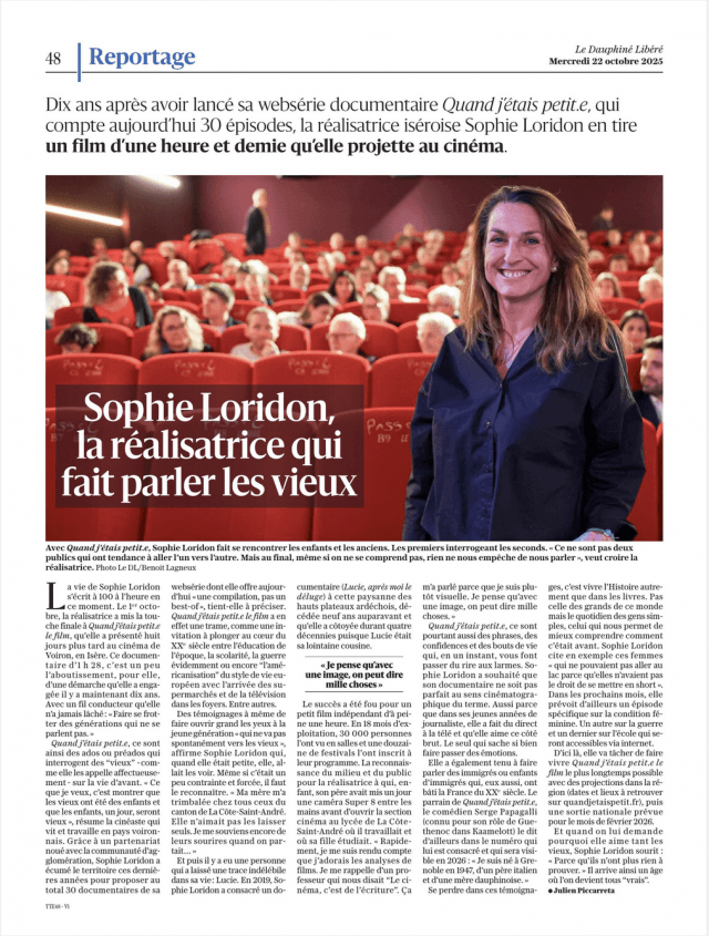 70 personnes âgées filmées depuis 2016, + de 200 enfants participants, le film Quand J’étais Petit-e est tiré de cette série de 30 films sur 10 communes en Isère : Murianette, Gillonnay, Voiron, Bilieu, Montferrat, Saint-Etienne de Crossey, Saint Geoire en Valdaine, Moirans, Tullins, Rives.